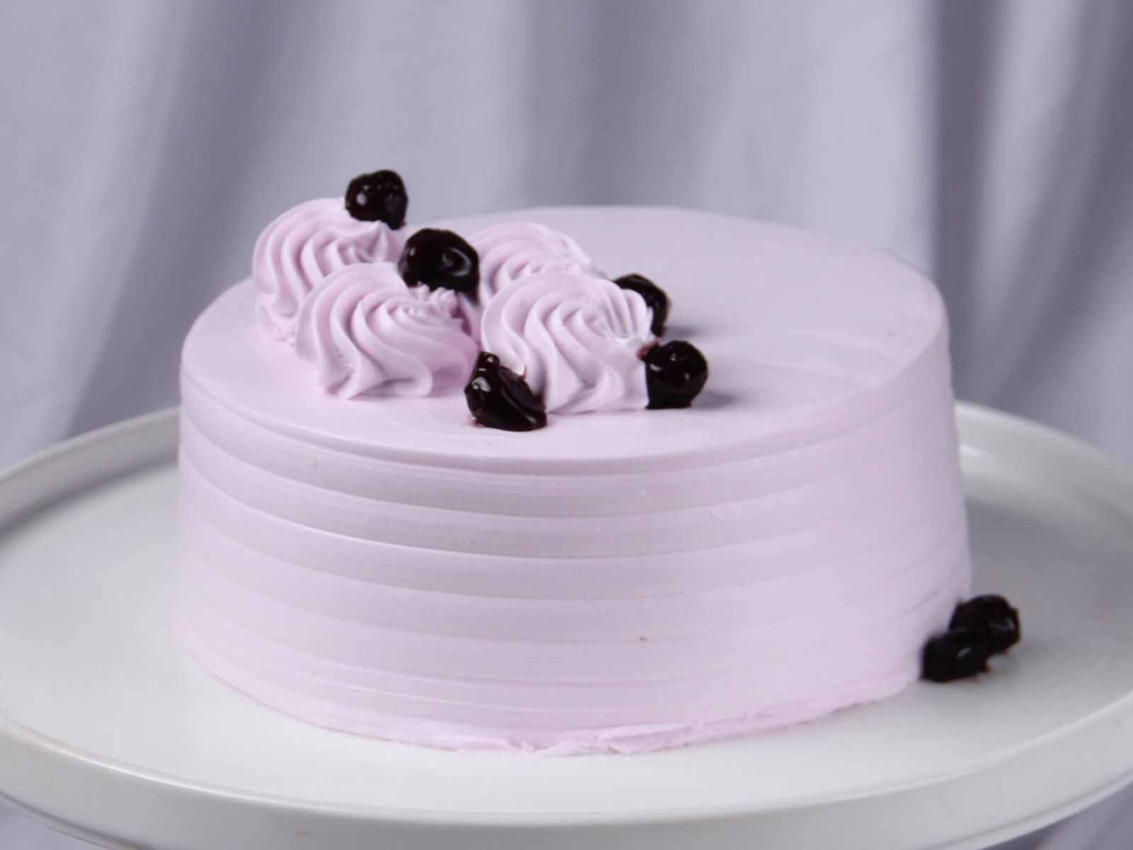 A visually soothing cake in pastel hues with layers of blueberry essence and delicate toppings for a mellow, fruity experience.