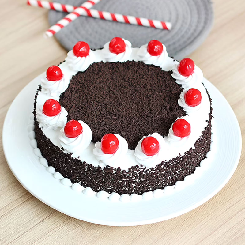 Topped with glazed cherries on soft chocolate layers